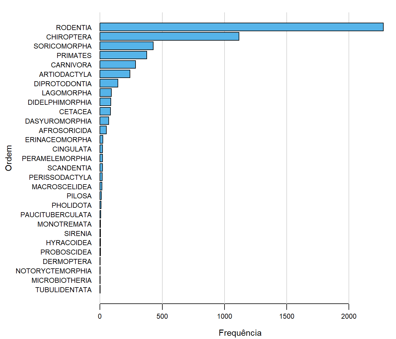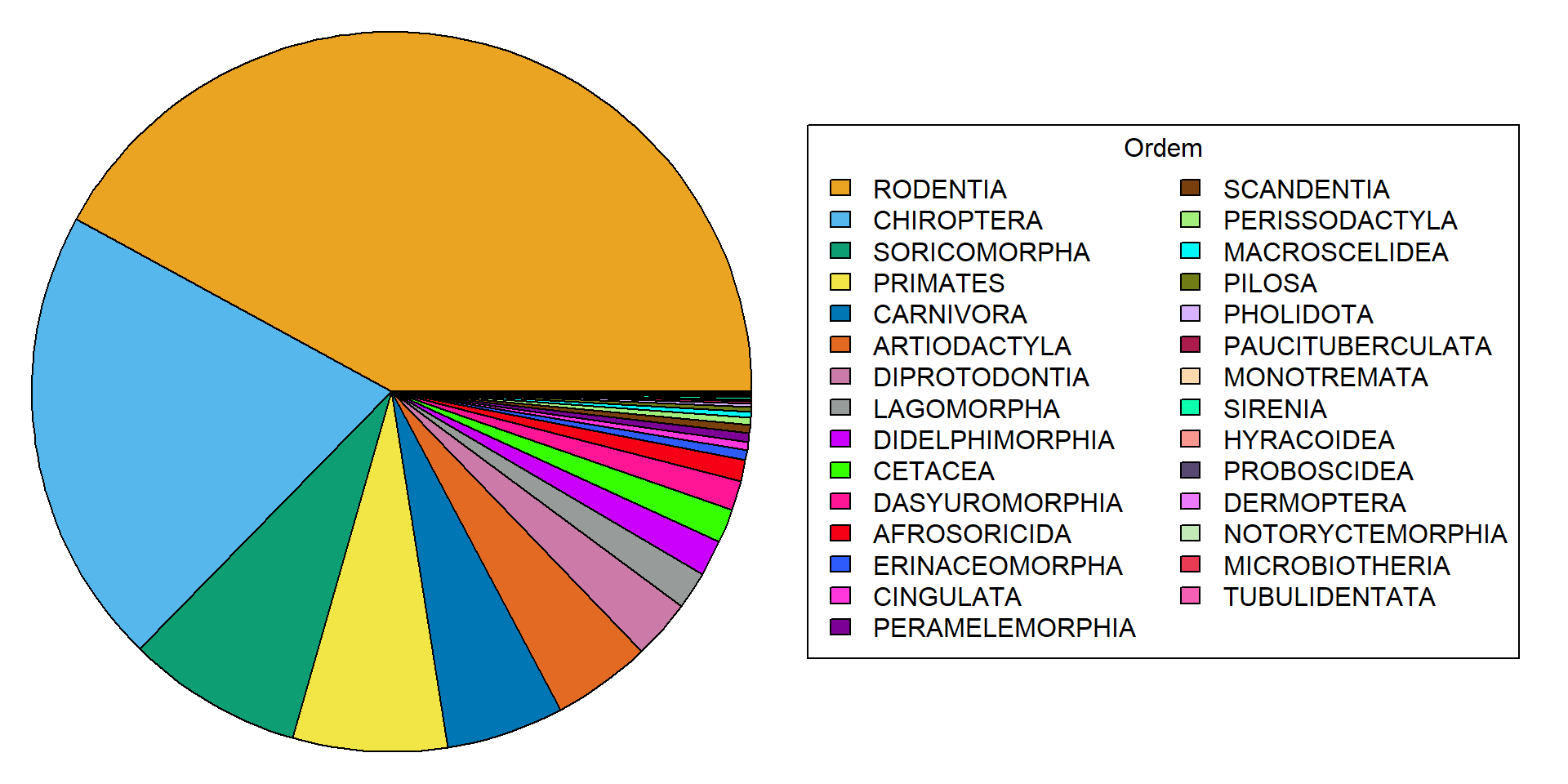O livro OpenIntro Statistics (Diez et al., 2019) ilustra este ponto com um exemplo da área da Biologia (Wilson & Reeder, 2005). O gráfico circular da Figura 3.4 pretende mostrar quantas espécies existem em cada ordem da classe dos mamíferos. Como existe um número elevado de ordens e algumas delas têm frequências muito baixas, o gráfico circular é totalmente ineficaz como forma de veicular a informação.