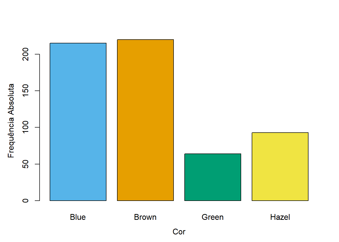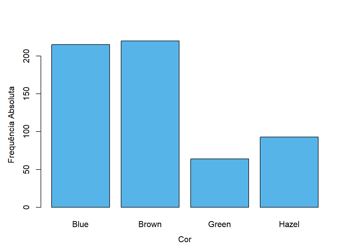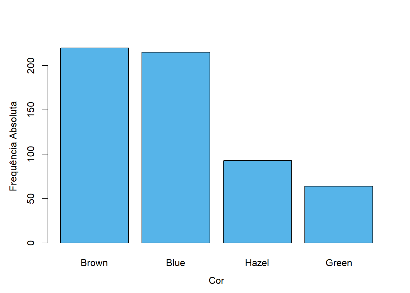 O conjunto de dados do R HairEyeColor contém a cor do cabelo e a cor dos olhos de um conjunto de alunos. A Tabela 3.1 mostra a tabela de contingência para a variável que contém a cor dos olhos.