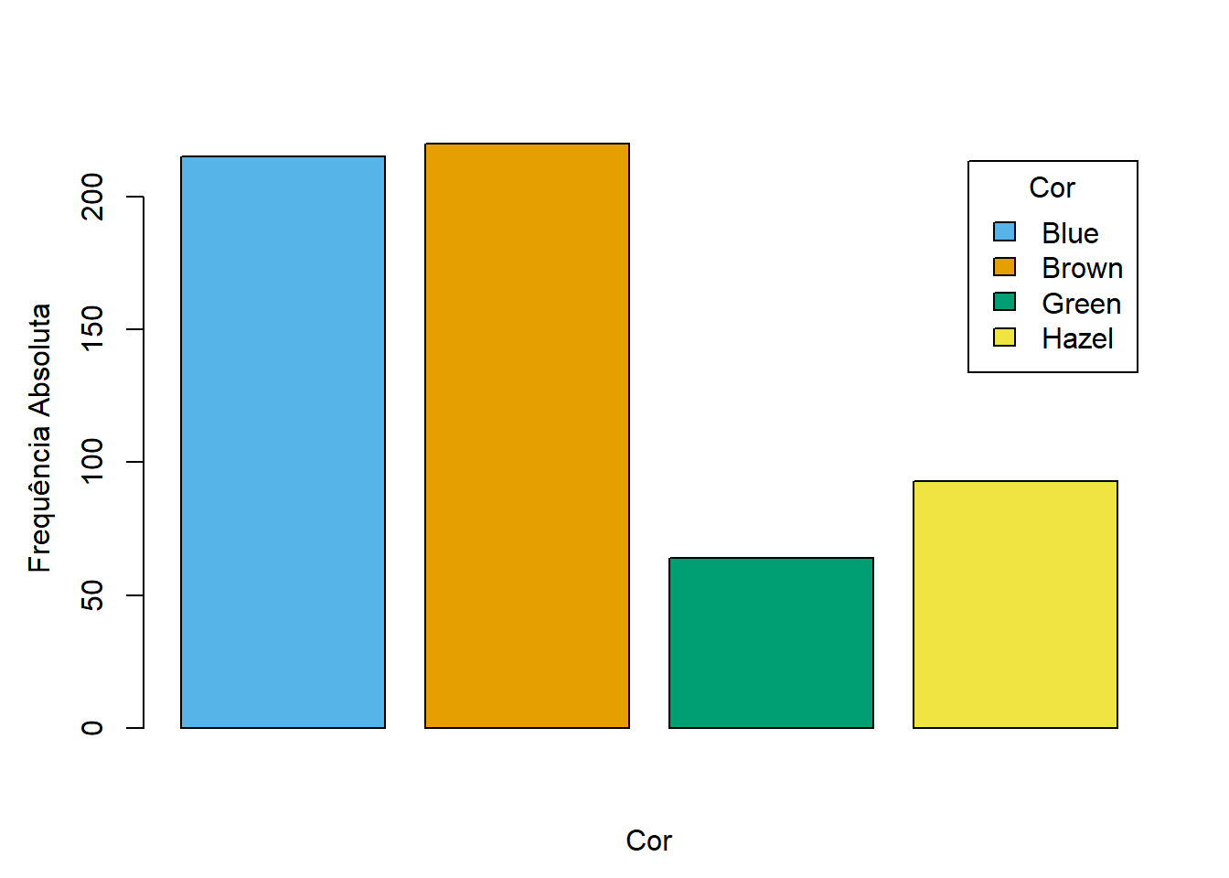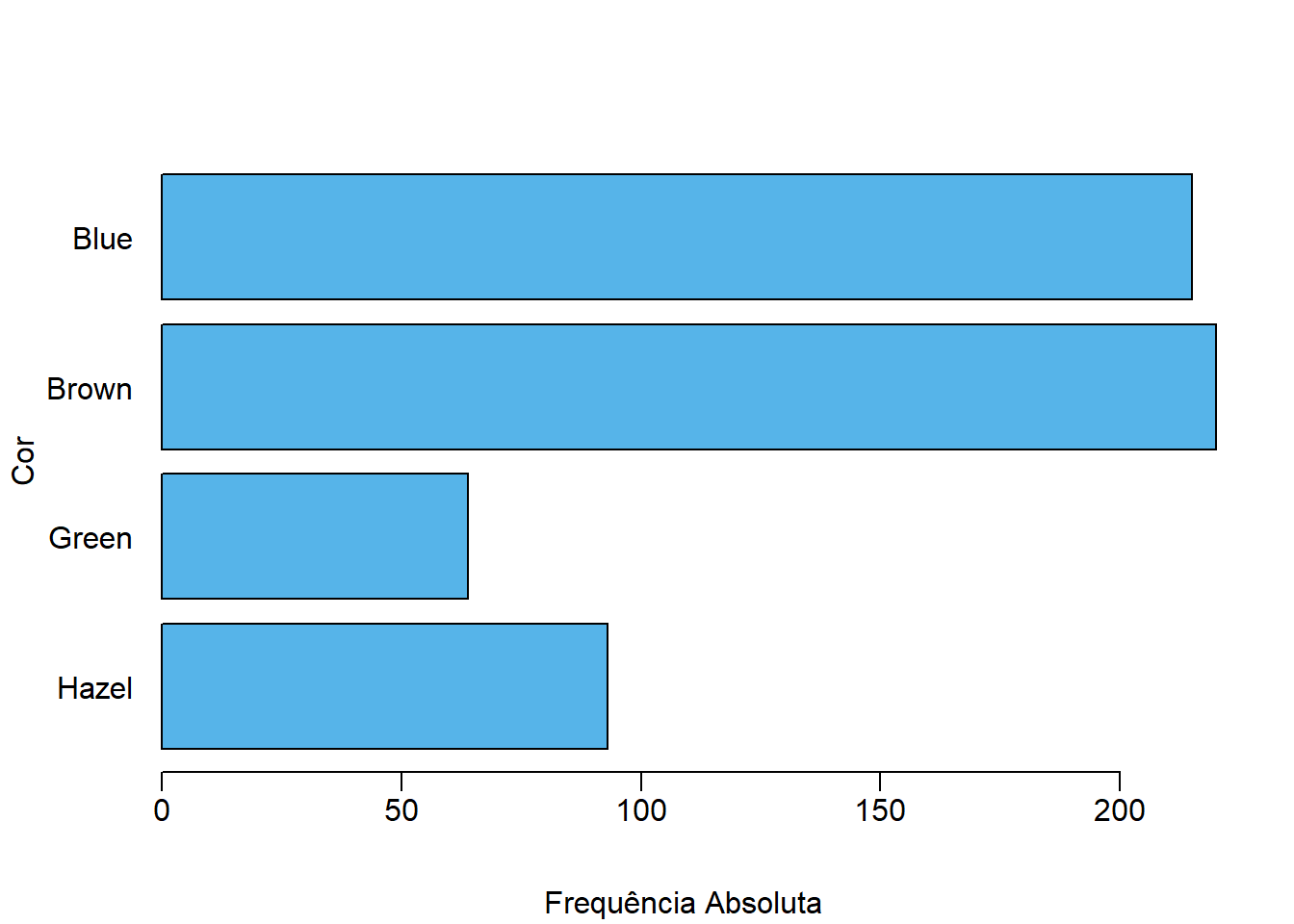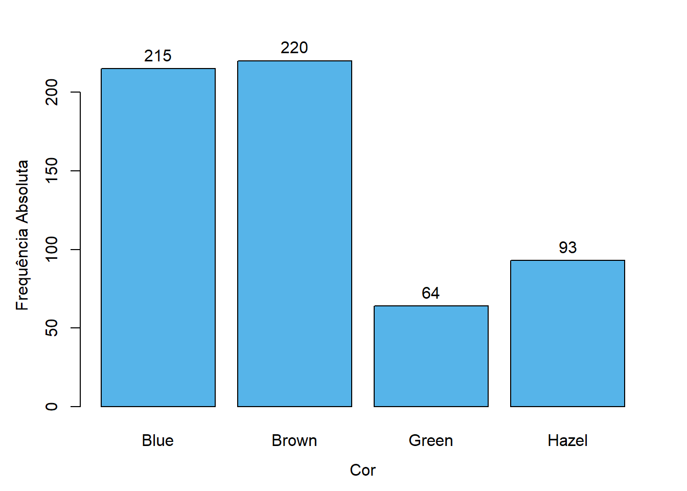 O conjunto de dados do R HairEyeColor contém a cor do cabelo e a cor dos olhos de um conjunto de alunos. A Tabela 3.1 mostra a tabela de contingência para a variável que contém a cor dos olhos.