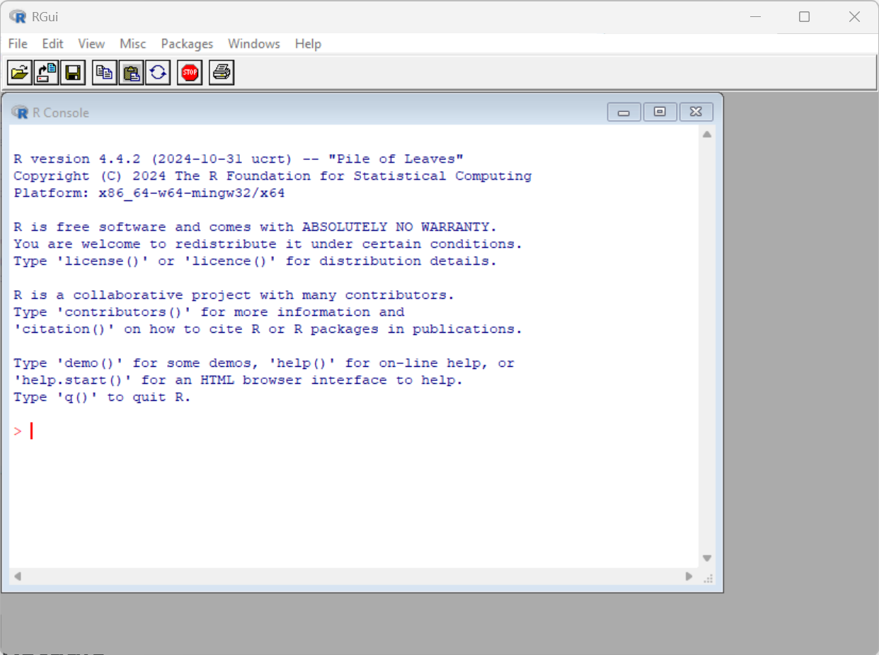 Após a instalação o R está pronto a ser utilizado. No entanto, a instalação base do R apenas dispõe de uma interface gráfica e um ambiente de desenvolvimento limitados. Por esse motivo, embora completamente funcional, é difícil justificar a utilização daquela interface, estando disponíveis melhores alternativas, como sugerido na secção Secção 7.3, a seguir.