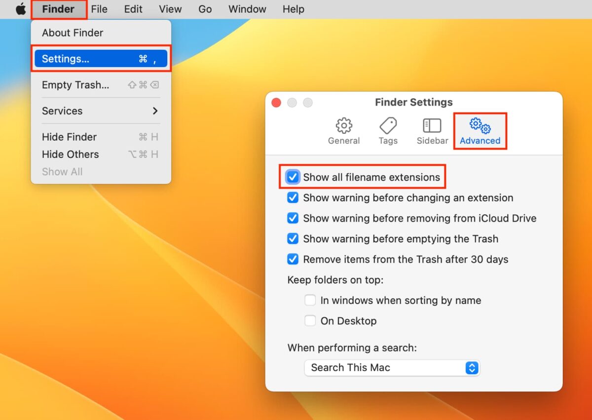 No macOS, abrindo o Finder, deve aceder-se a Settings… > Advanced e ativar a opção Show all filename extensions, conforme ilustrado na Figura 7.8.
