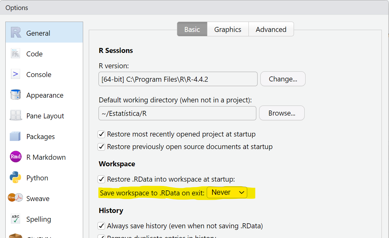 Numa nova instalação, o RStudio está configurado para perguntar ao utilizador se quer guardar os resultados ao terminar a sessão e para carregar automaticamente esses resultados no início da sessão seguinte. Podendo haver um ou outro caso onde este procedimento faça sentido, recomenda-se a alterar este comportamento do RStudio.
