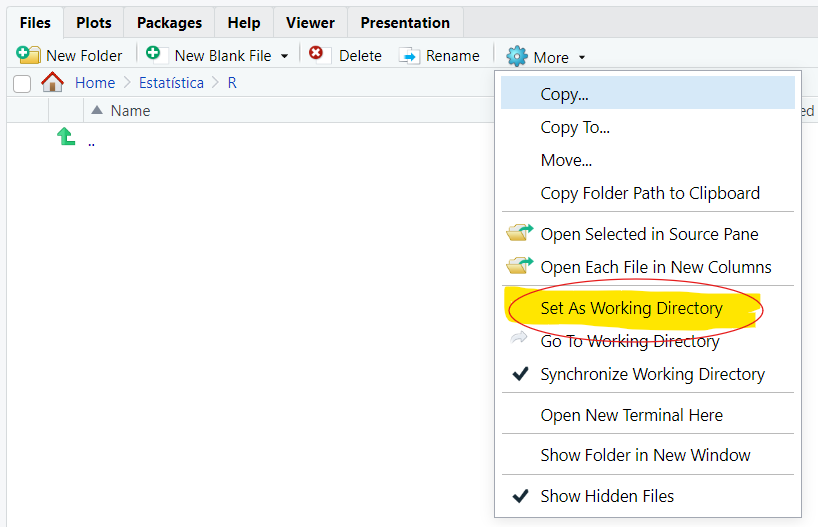 Também é possível modificar a pasta de trabalho de forma temporária. Para isso, no painel Files deve navegar-se até à pasta que se quer indicar como a pasta de trabalho e fazer More > Set As Working Directory. Na Figura 7.4 ilustra-se o procedimento. Note-se que este processo é equivalente a utilizar a função setwd() na consola.