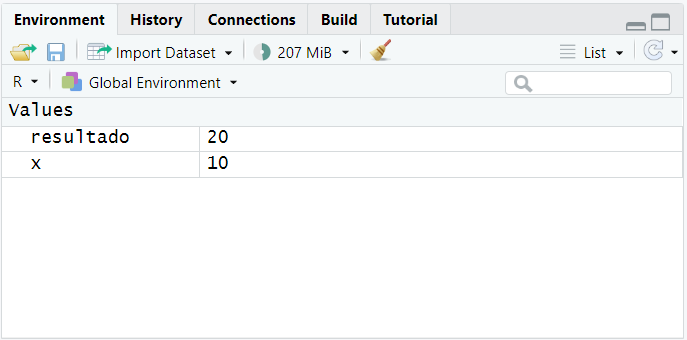 [1] 20Para inspecionar o valor de um objeto, basta digitar o nome na consola ou verificar o painel Environment (Figura 8.1).