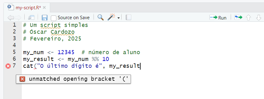 À medida que o código é editado o RStudio vai diagnosticando e assinalando problemas e potenciais problemas junto ao número da linha. A Figura 8.3 ilustra a situação. No exemplo, falta fechar o parênteses na última instrução, facto que o RStudio deteta e assinala.