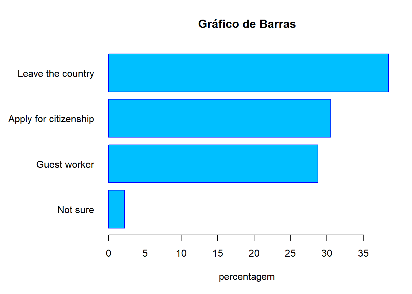 par(mar =c(5, 9, 4, 2)) # alargar a margem esquerdabarplot(sort(pt_res) *100,main ="Gráfico de Barras", xlab ="percentagem",col ="deepskyblue", border ="blue",horiz =TRUE, las =1)