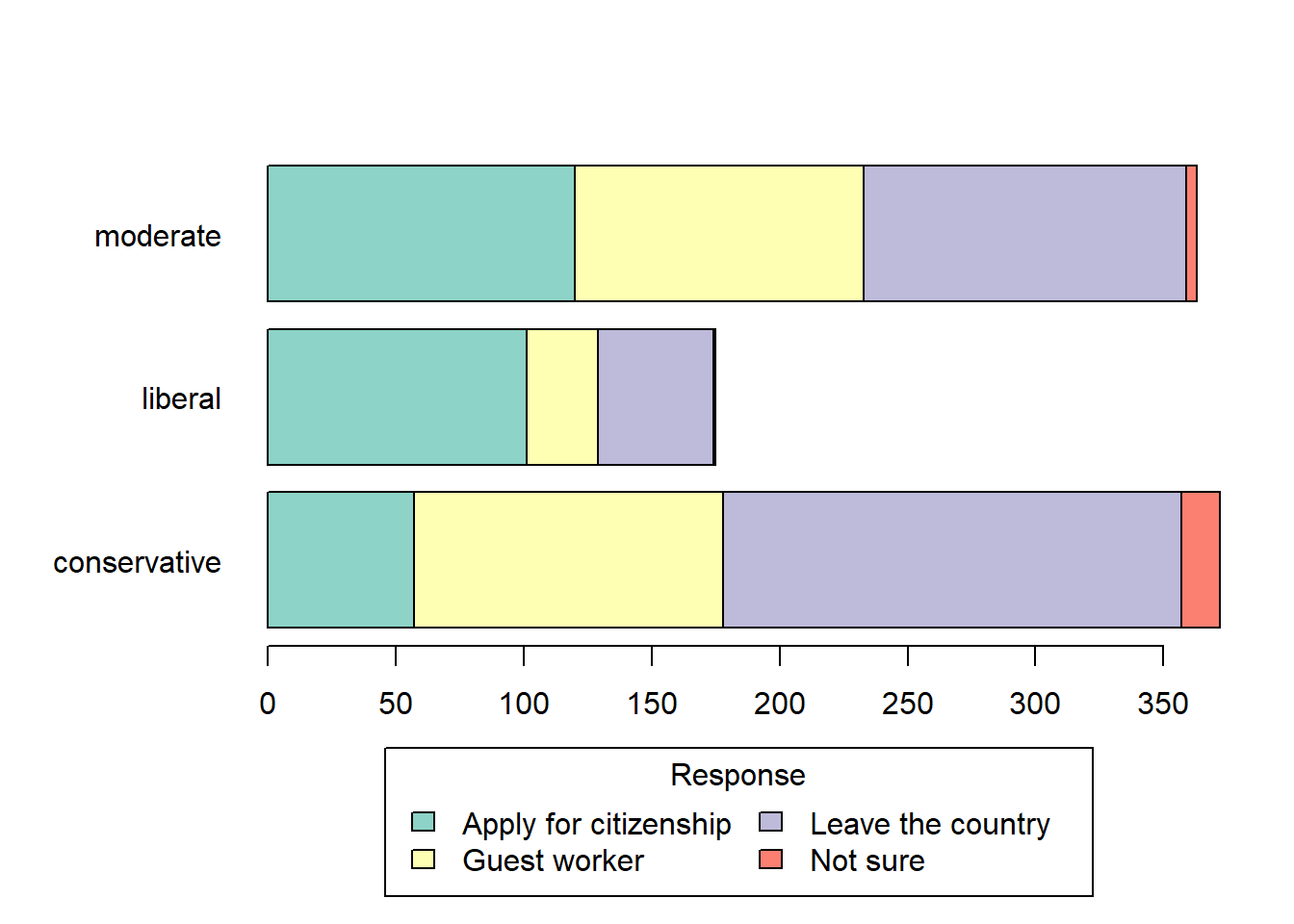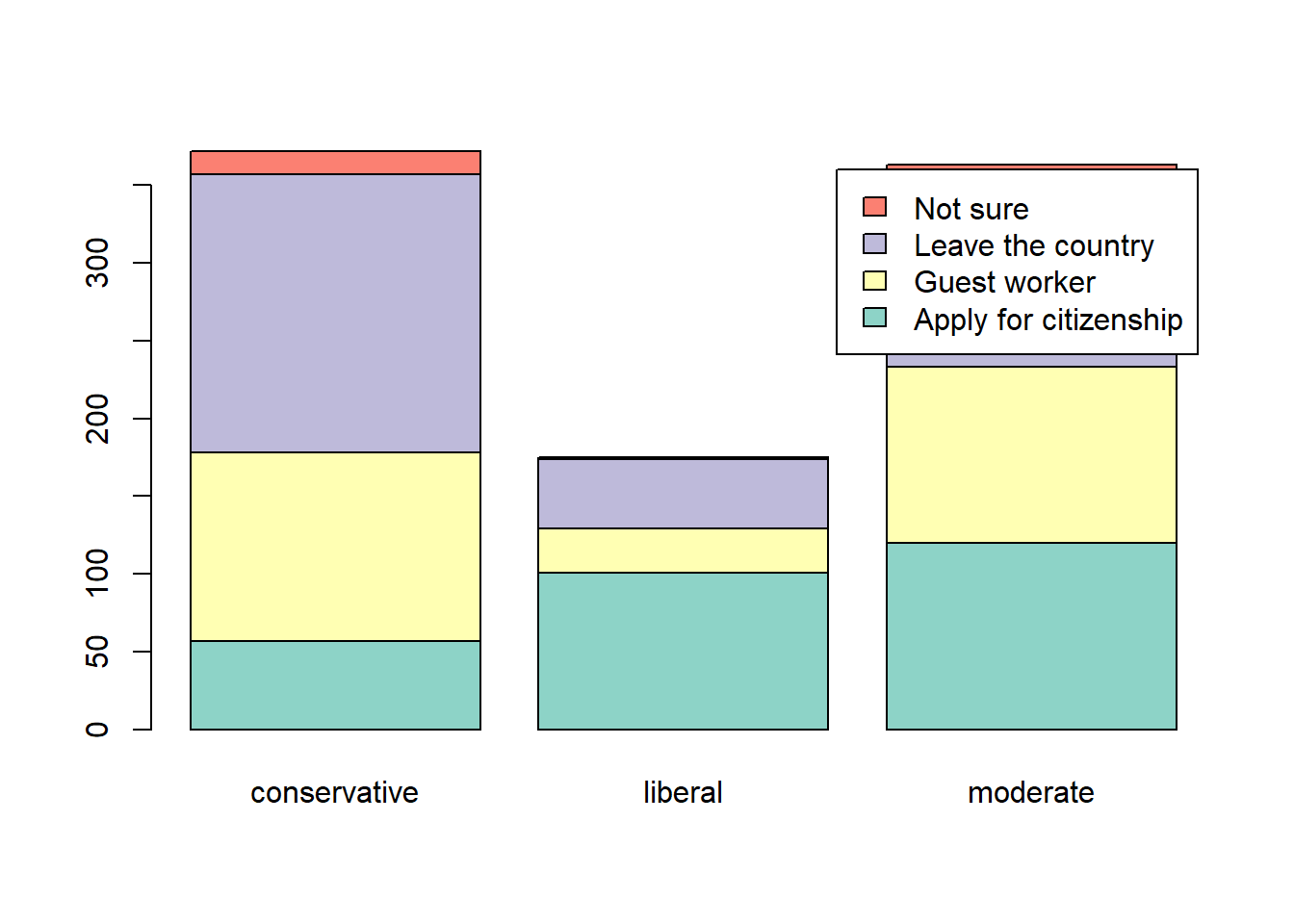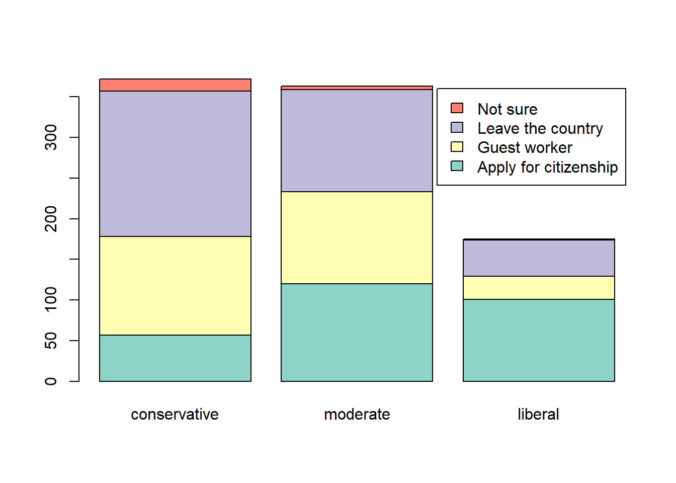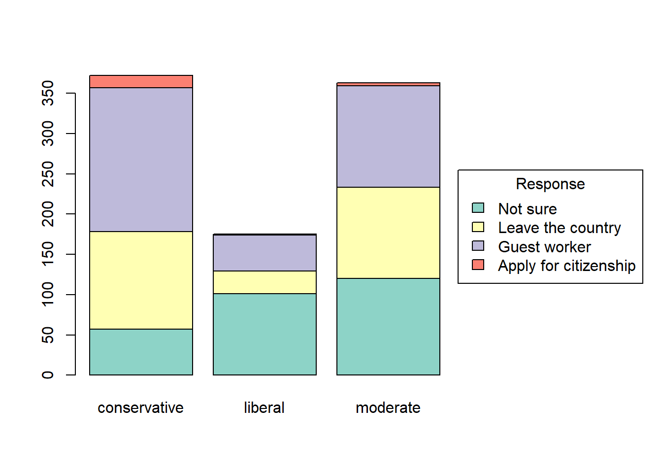 A variável response regista a resposta à questão do inquérito sobre que tratamento dar aos trabalhadores ilegais nos EUA. A variável political indica qual a ideologia política do respondente. Trata-se portanto de duas variáveis nominais (eventualmente poder-se-ia ordenar a ideologia do mais à esquerda para o mais à direita, se tal fosse relevante).