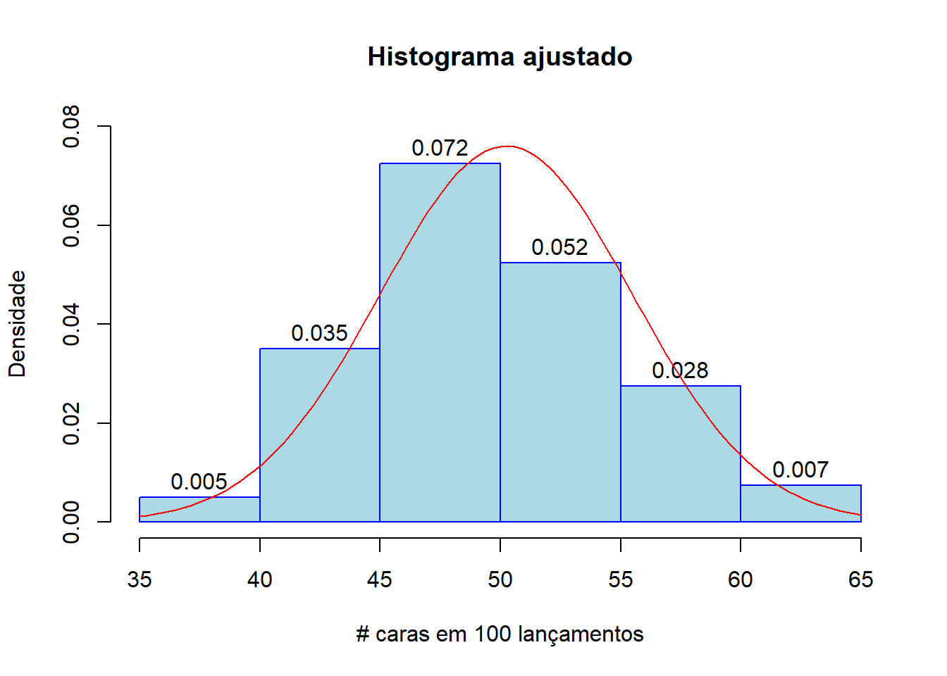 Note-se que foi utilizada a função plot() à qual foi passado o objeto h. Este procedimento é equivalente a invocar hist(coin) e passar os restantes argumentos. De facto, tanto a função plot(), como a função hist(), nos bastidores, vão invocar o mesmo código para desenhar o histograma.